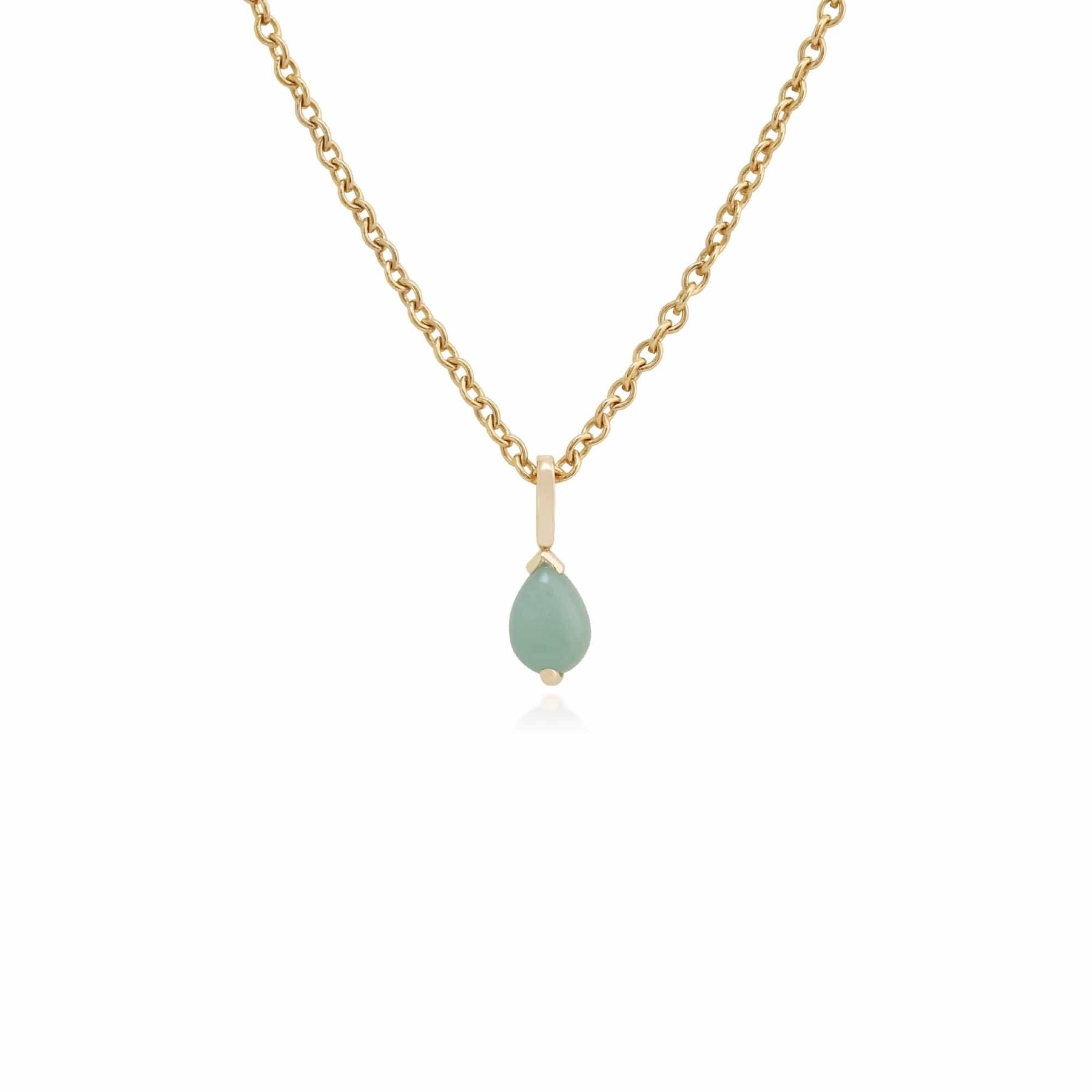A stunning 9ct yellow gold stud earring and necklace set featuring pear cabochon dyed green jadeite gemstones in a three claw setting.
