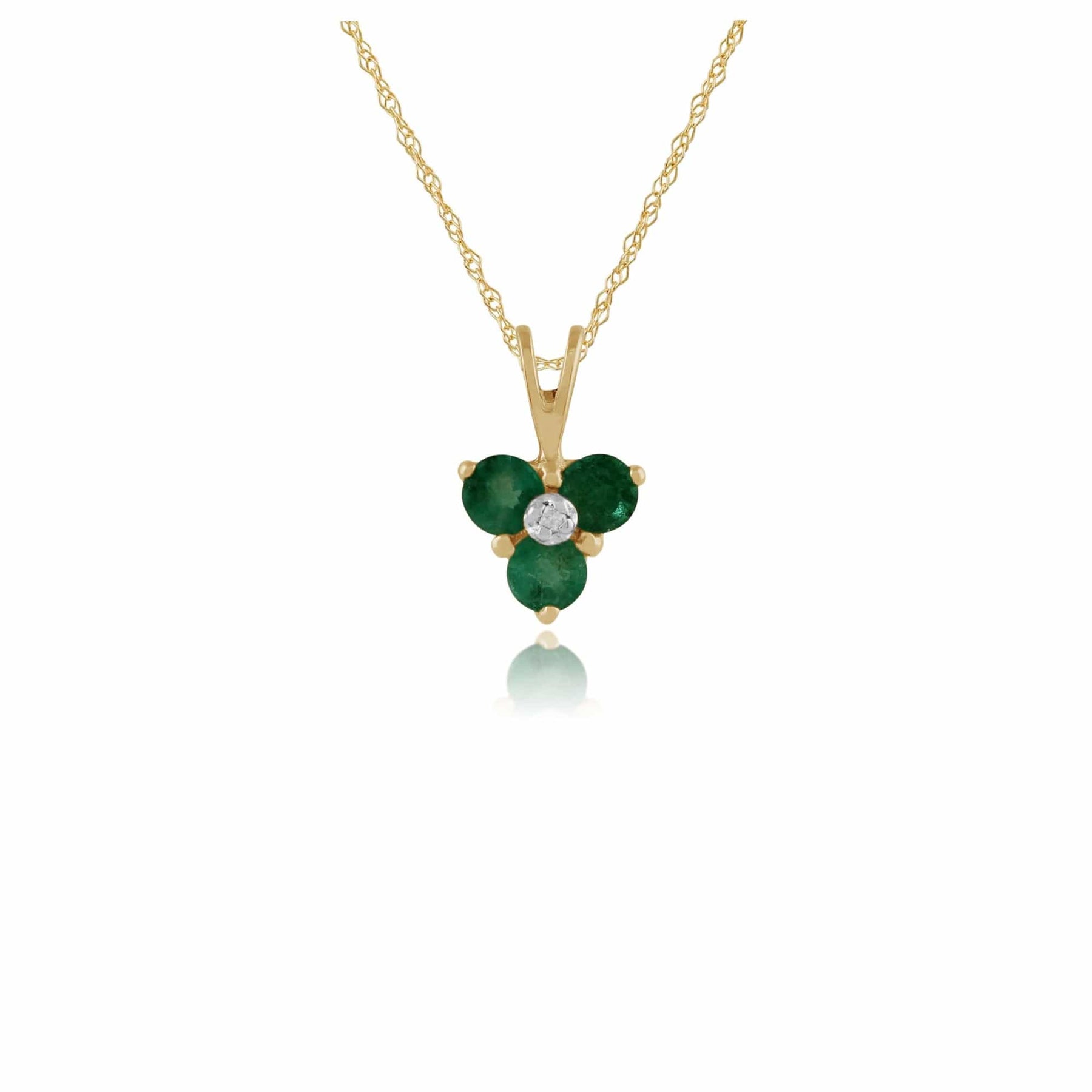 9 carat yellow gold pendant with three green emerald gemstones in a floral pattern surrounding a single brilliant cut white diamond