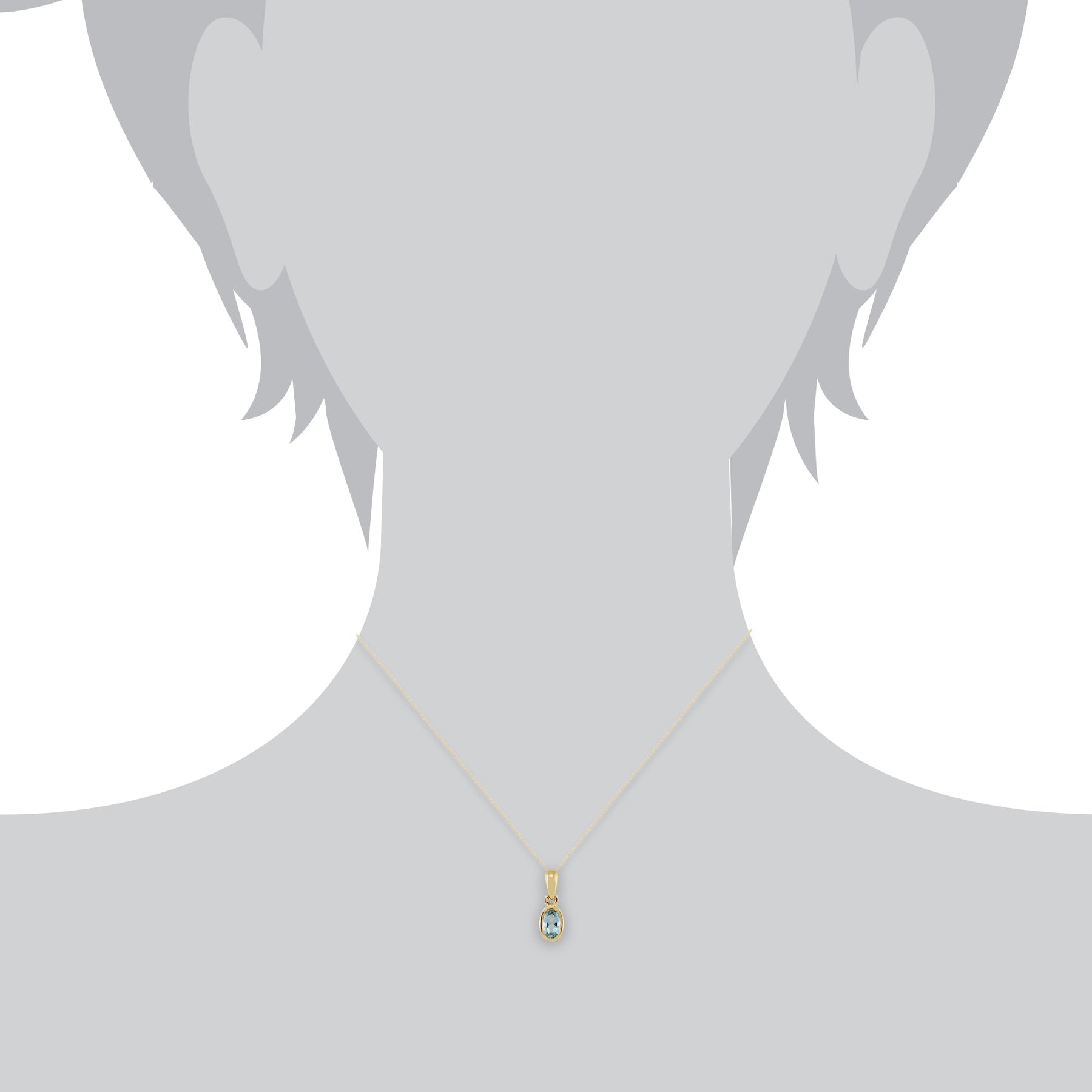 This oval pendant is framed with 9ct yellow gold and features a sparkling aquamarine gemstone.