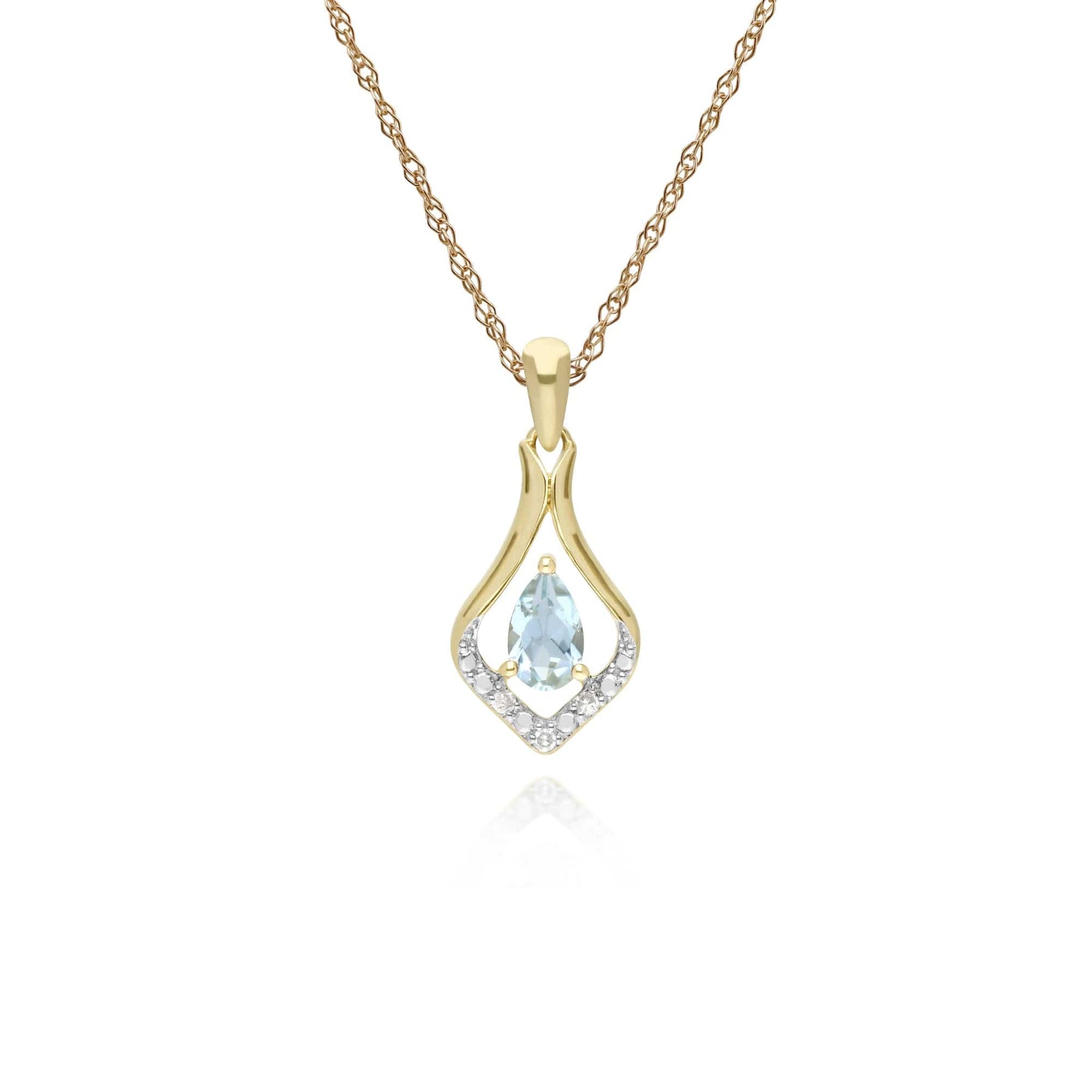 An elegant leaf earring and 45cm necklace set crafted from 9ct yellow gold, set with a pear cut faceted aquamarine gemstone and diamond gemstones. This set comes with a matching 45cm 9ct yellow gold chain.