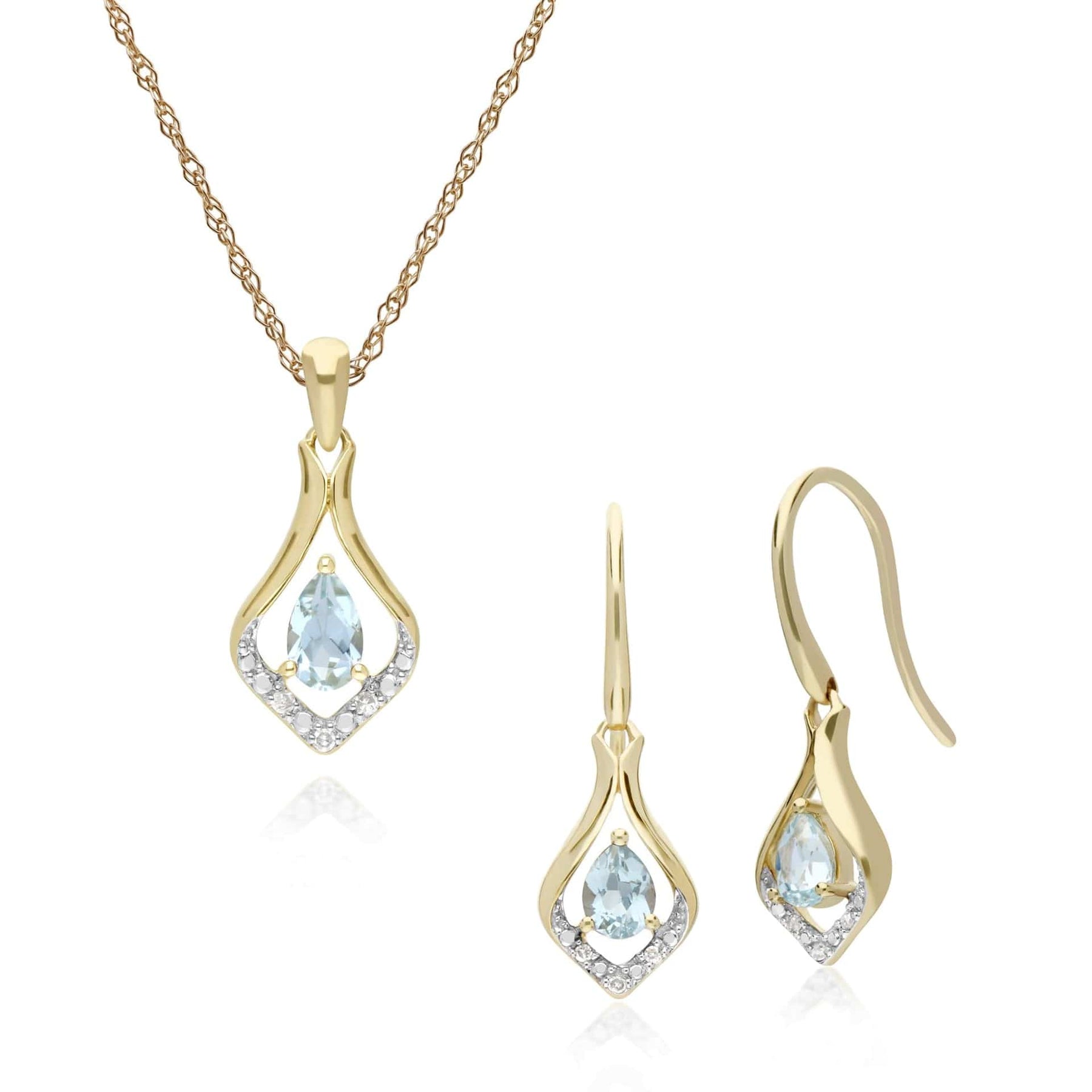 Classic Oval Aquamarine & Diamond Leaf Drop Earrings & Pendant Set in 9ct Yellow Gold