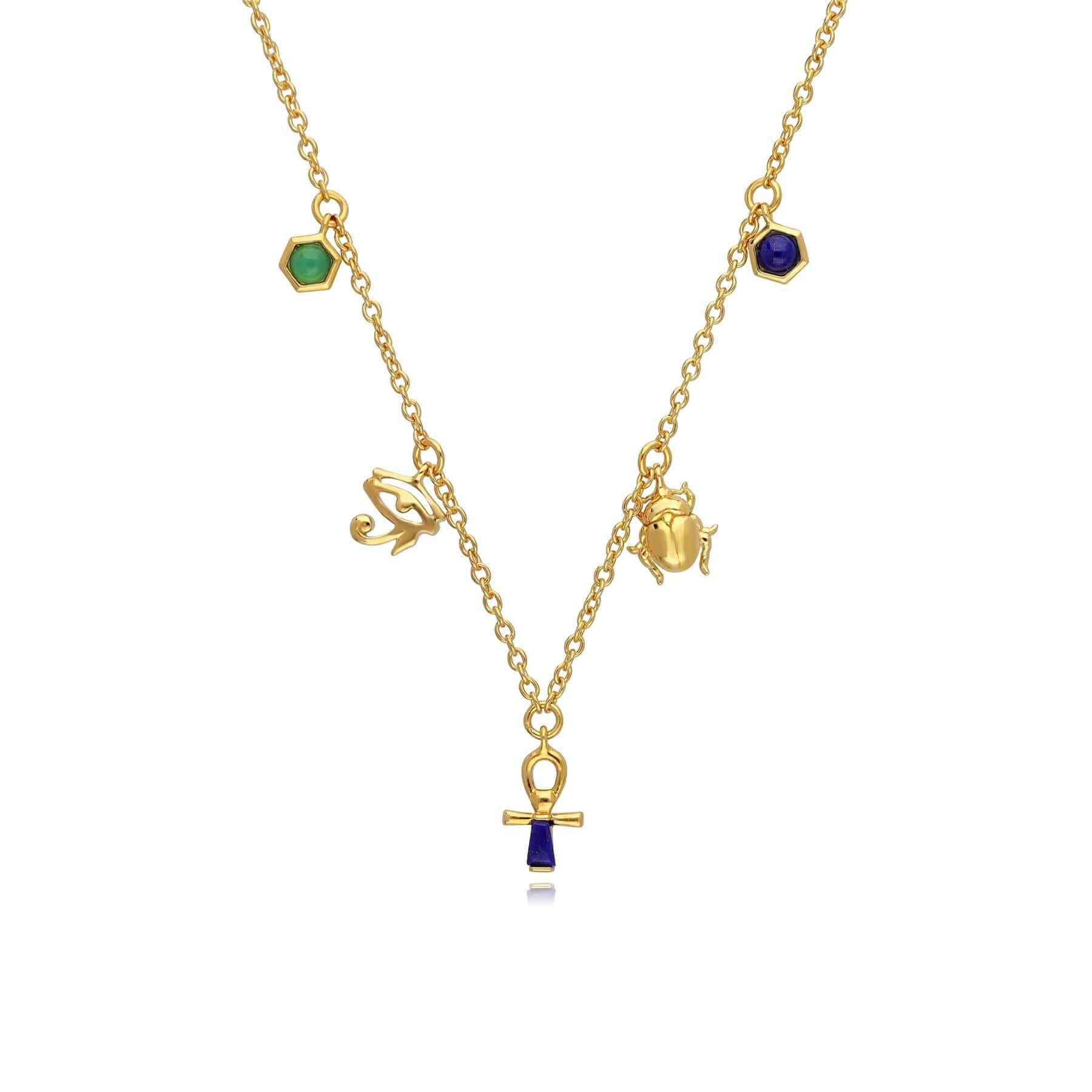 Channel your inner empress with this 9ct gold choker necklace inspired by ancient Egypt's most iconic ruler. Featuring beautiful Egyptian symbols such as the Eye of Ra, Ankh and Scarab alongside colourful gemstones on a glittering gold chain. This necklace is 38cm in length with a 5.5cm extender.