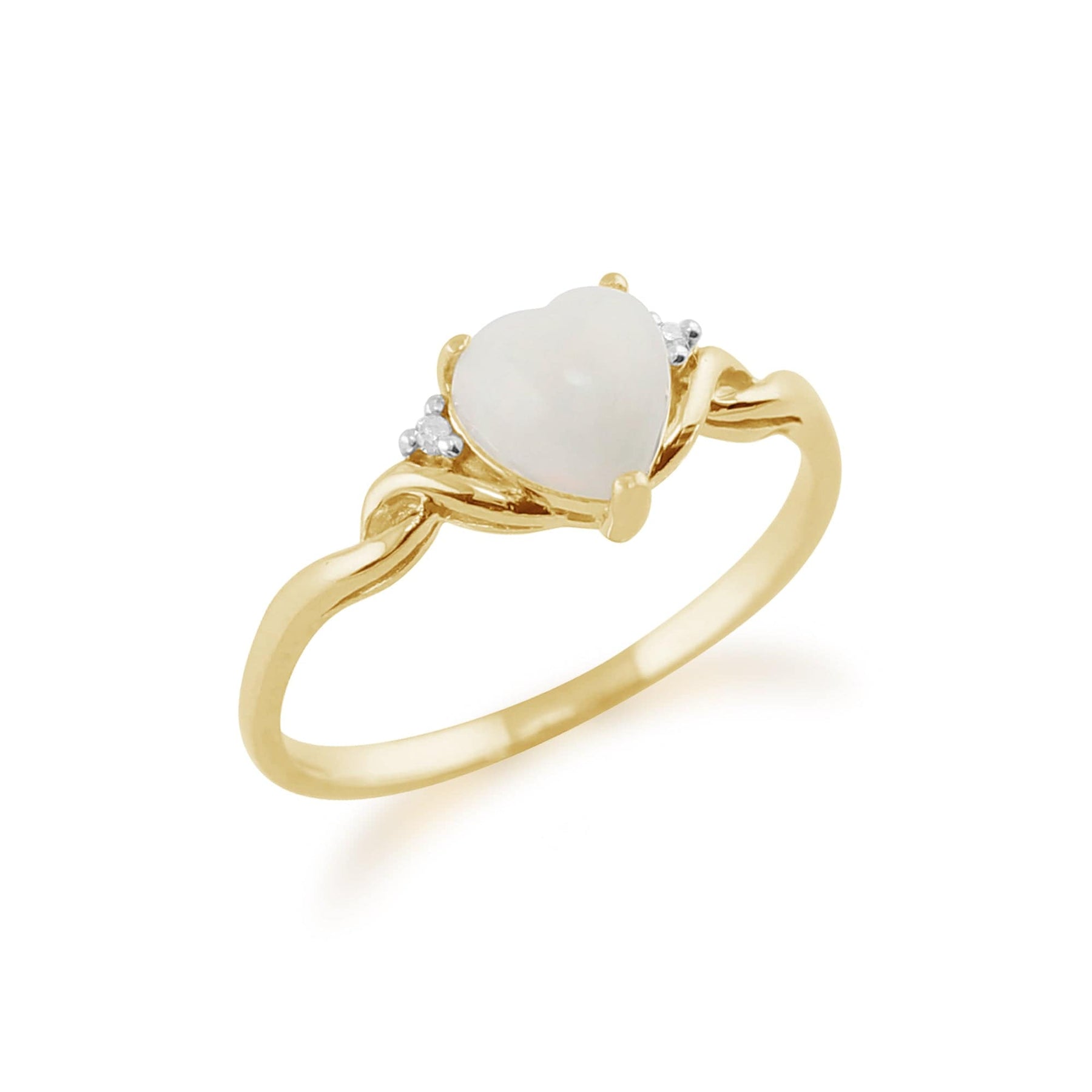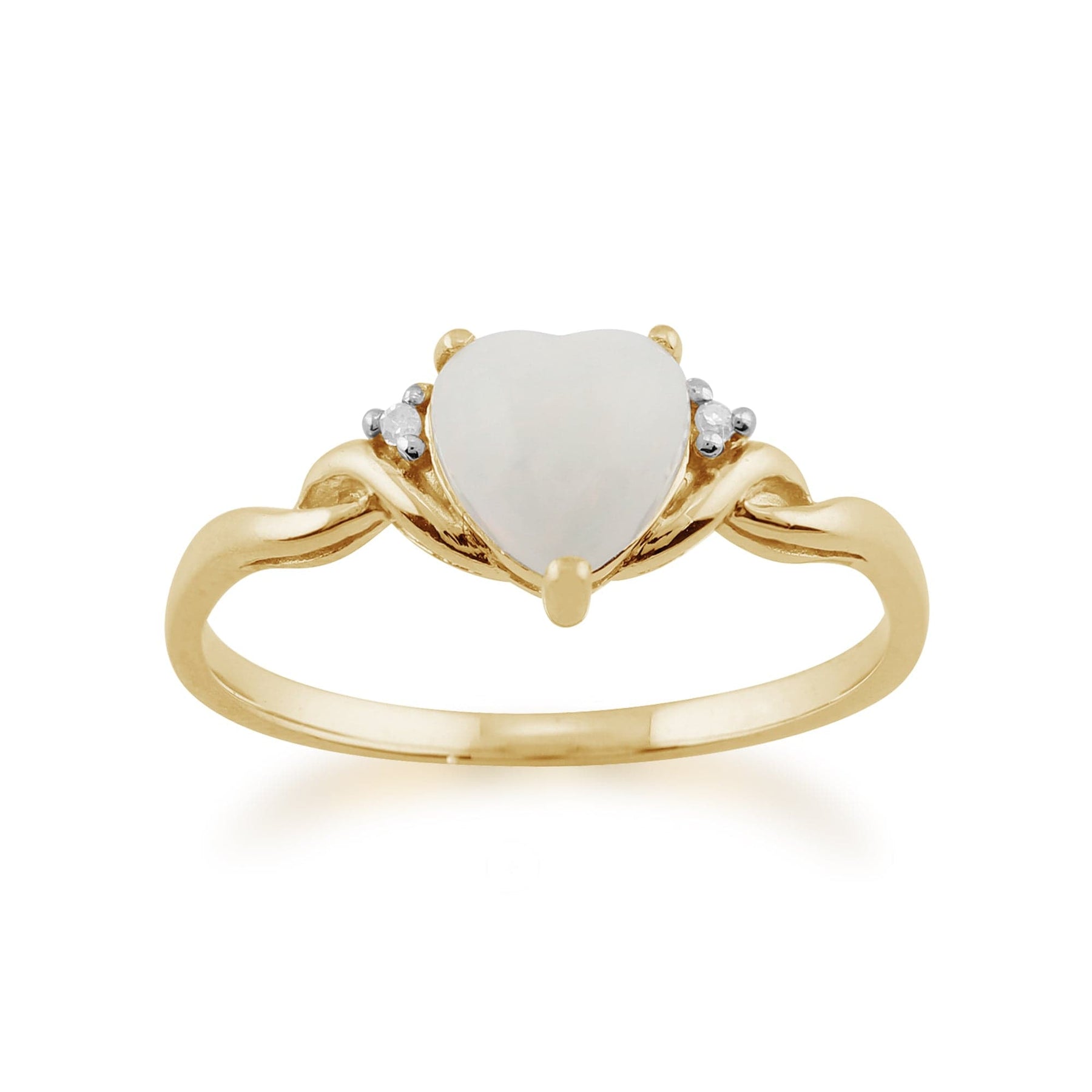 A beautiful heart cut opal gemstone ring with diamond accents on a classic 9ct yellow gold ring band.