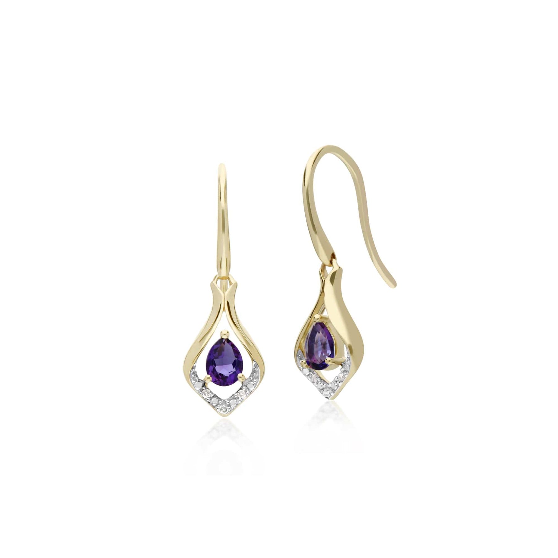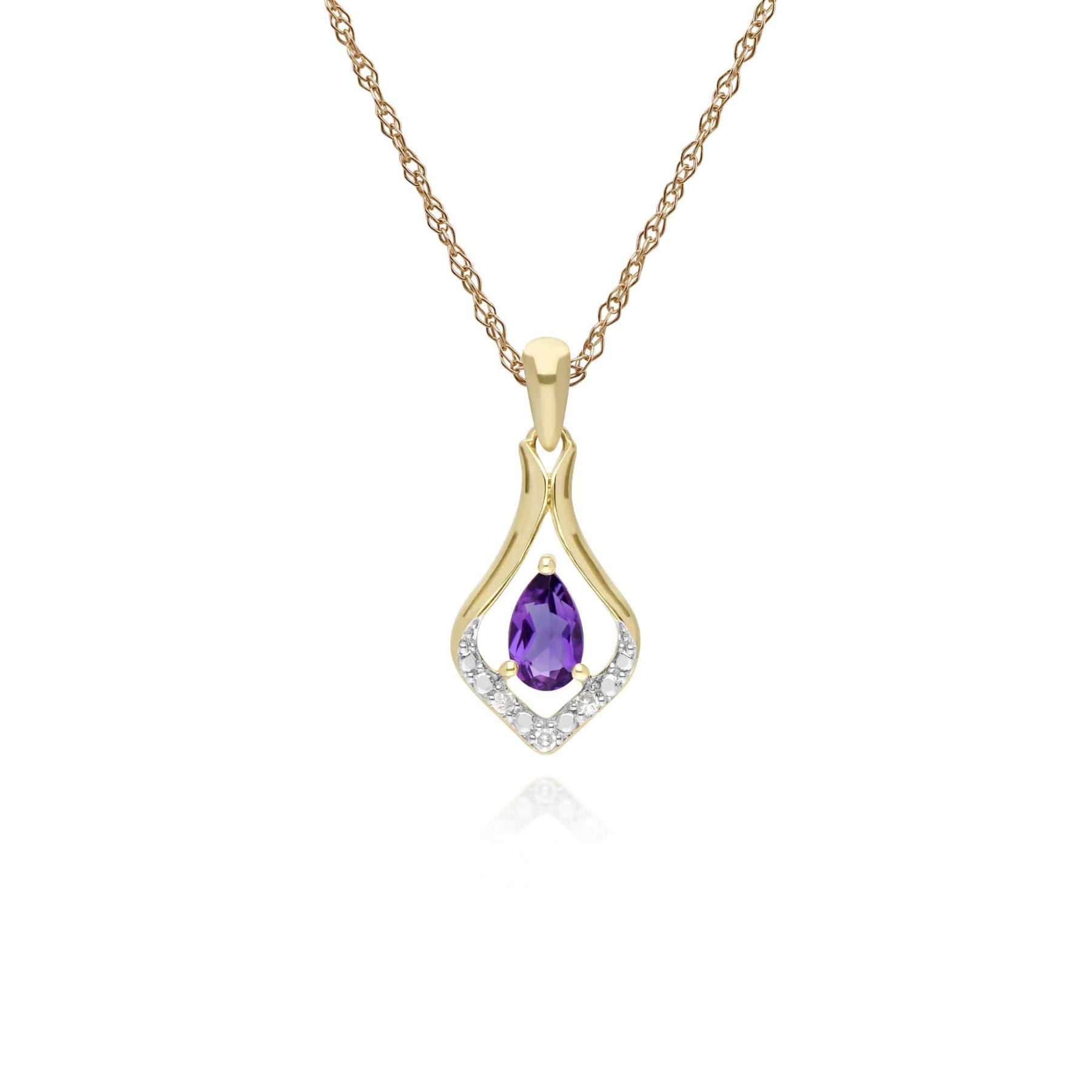 An elegant leaf earring and 45cm necklace set crafted from 9ct yellow gold, set with a pear cut faceted amethyst gemstone and diamond gemstones. This set comes with a matching 45cm 9ct yellow gold chain.