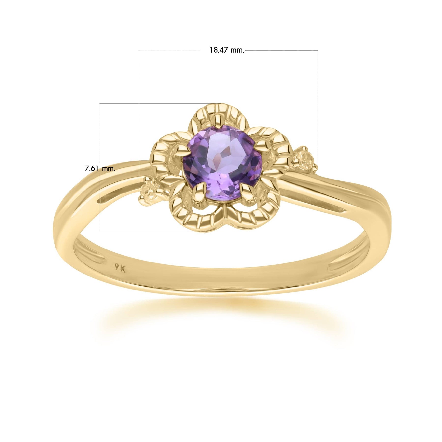 Floral Round Amethyst & Diamond Ring in 9ct Yellow Gold