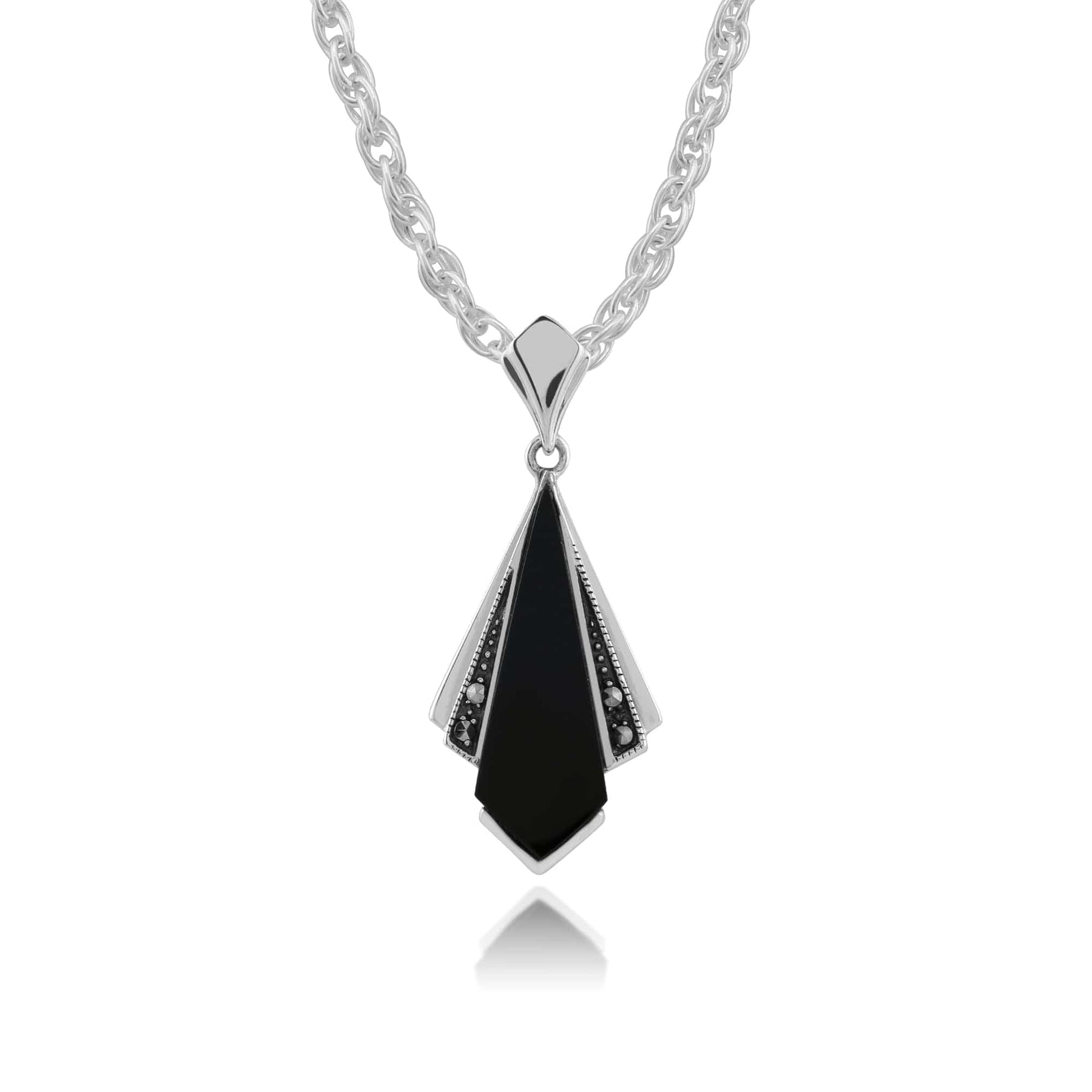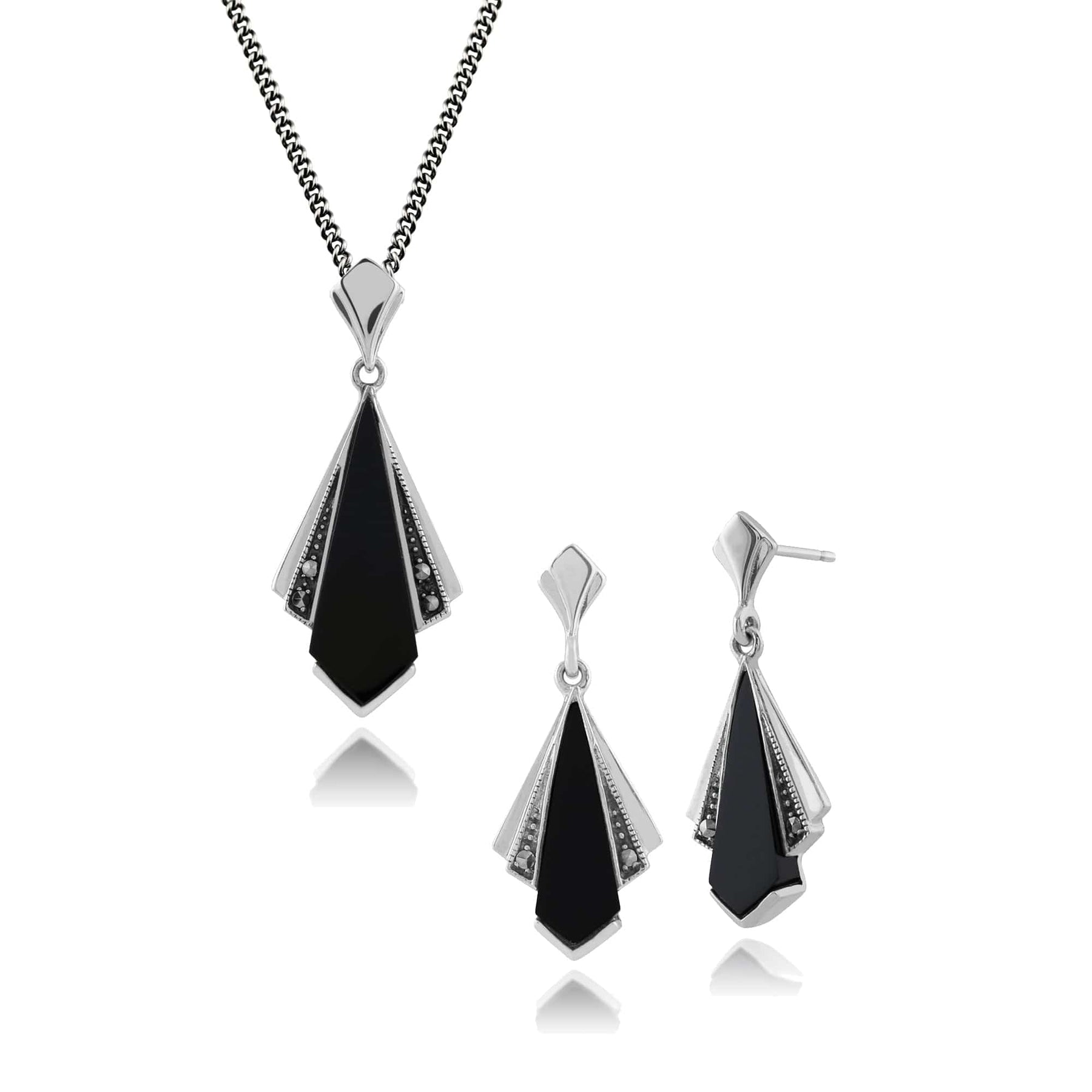 A beautifully designed art deco style drop earring and necklace set, with black onyx and marcasite gemstones.