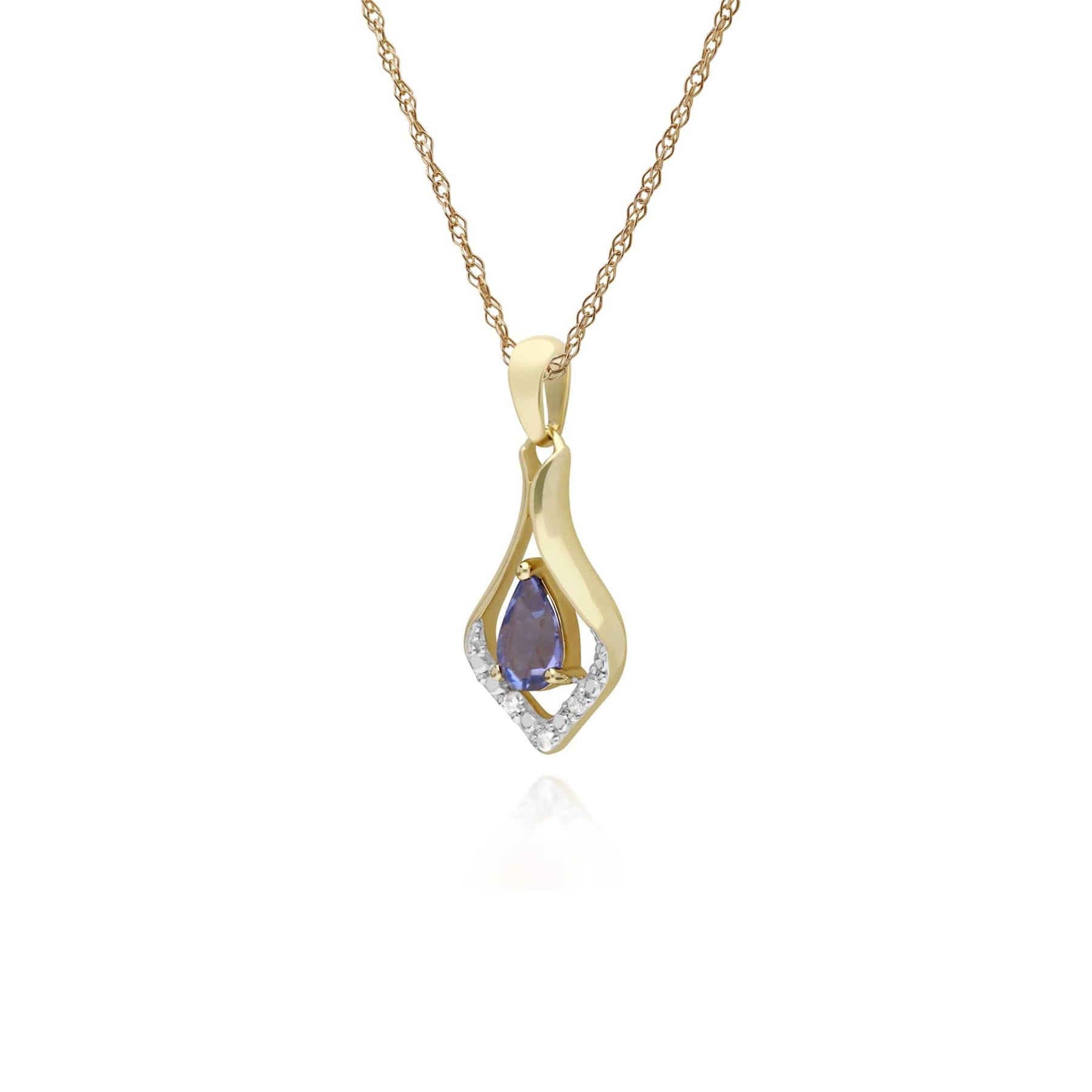 A refined leaf pendant crafted from 9ct yellow gold, set in the middle with a pear cut faceted tanzanite gemstone and diamond gemstones. This pendant comes with a matching 9ct yellow gold 45cm / 18inch chain.