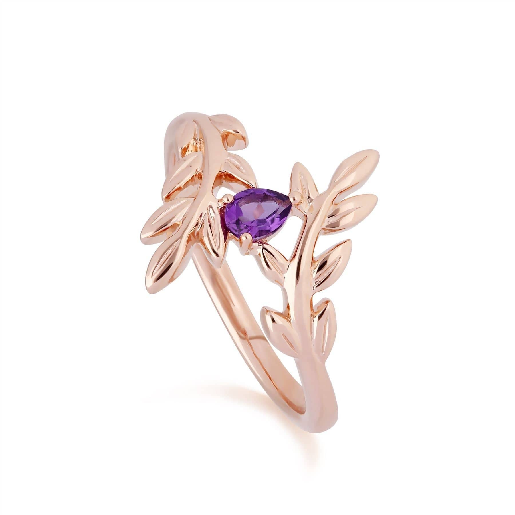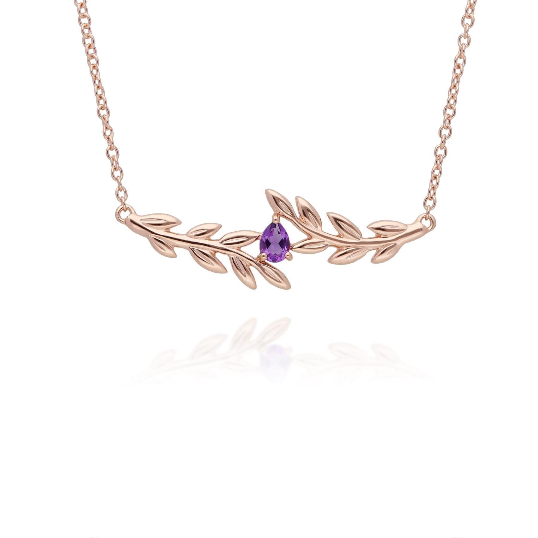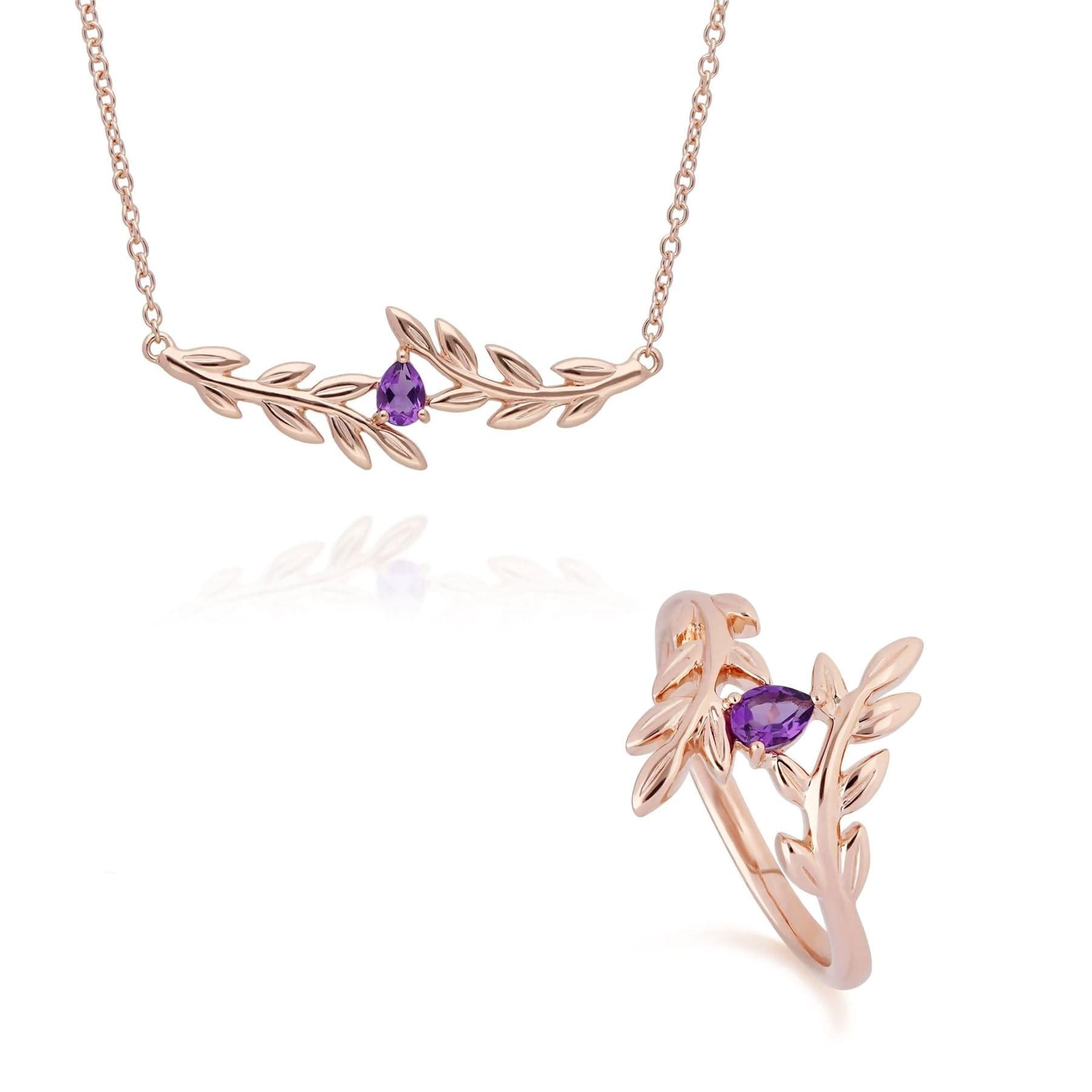 An elegant nature-inspired rose gold necklace and ring set with amethyst in a beautiful olive branch motif. Layer up your favourite gold pieces to elevate your look.